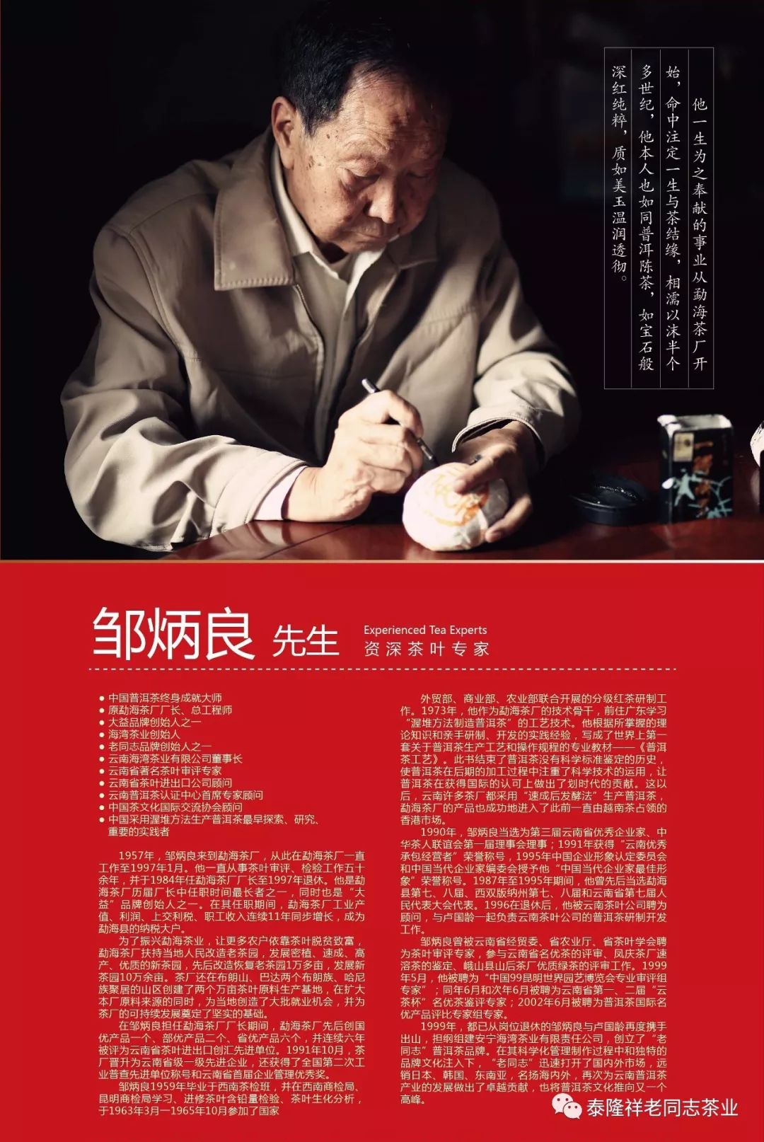 茶叶结下不解之缘,开始了与茶相伴的一生。1973年,邹炳良前往广东考察学习“渥堆方法制造普洱茶”的工艺技术。考察归来后,邹炳良先生和同行们一道组成技术攻关小组,通过反复的研究和实验,取得了普洱茶人工发酵的成功,开创了云南普洱茶快速发展的全新时代。此后,邹炳良先生根据自己的专业知识和实践经验,撰写了第一套关于普洱茶生产工艺和操作规程的教材,成为现代普洱茶熟茶生产的技术领头人,被业界尊称为“普洱茶一代宗师”、“现代普洱熟茶之父”。 1984年,邹炳良先生出任勐海茶厂厂长。当时云南茶叶实行统购统销,市场上认可的基本只“中茶”牌商标。作为时任勐海茶厂厂长的邹炳良先生意识到,勐海茶厂要做大做强,必须要拥有自己的自主品牌。他与厂领导班子卢国龄等人共同创意、研究,因为品饮普洱茶对人体“大大有益”,所以,设计创立了“大益”牌商标,并于1989年成功注册,创下了企业的独立品牌。并把“大益”牌商标打造成为勐海茶厂巨大的无形资产。1997年1月,邹炳良正式从勐海茶厂退休。 1959年,卢国龄“先生”(女性,因学识渊博,德高望重,被人尊称为“先生”)被调到勐海茶厂。 卢国龄到勐海茶厂后,先后供职于供销科、车间、财会科、生产、企业管理等部门。 1985年,国家放开茶叶市场,取消统购统销,各个茶厂自立更生。生性不怕输的卢国龄挺身而出,站到了市场开拓的最前端。她带领厂里的营销人员奔波于全国各地,采用逐步推开战线并占领阵地的策略为勐海茶厂打开了市场。在她和全厂职工的共同努力下,勐海茶厂的影响力和知名度大大提高,产销量达到历史最高水平。 1987年,卢国龄任勐海茶厂副厂长。1996年,卢国龄从勐海茶厂离休。 1997年,两位大益茶品牌的创始人从勐海茶厂退休后,受聘于中国土产畜产云南茶叶进出口公司,担任普洱茶的生产总顾问。两年后,两位老同志联合四个投资人,合作组建了安宁海湾茶业有限责任公司,注册资本50万元人民币,公司占地面积13亩,并于当年10月份建成投产。“老同志”普洱茶品牌也由此诞生。 “老同志”普洱茶商标具有独特性,令人过目难忘,与海湾的人文背景非常契合,加上海湾茶业产品质量过硬,老同志普洱茶刚一推出就大受欢迎。经过近十余年的发展,海湾茶业规模逐步壮大,创出了“老同志、加嘉等一批知名品牌”,10余个品种,拥有职工近150余人,公司生产近70%的产品主要出口港、澳、台、日本、东南亚、欧美等国家,30%的产品为内销,产品倍受消费者青睐。 老同志普洱茶在两位老同志的带领下,浓缩了两个世纪的制茶文化,让许多人感受到了普洱茶的清纯、淡雅、遐思和历史的沉淀。“让更多的人,喝到真正的普洱茶”。