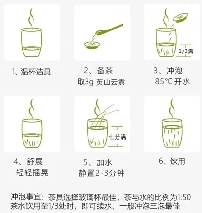 冲泡方式:先在杯中注入85℃开水预热倒掉,再取3g的英山云雾干茶放入杯中,倒入少量85℃开水冲泡,待其舒展后摇开,然后再加水,放置两三分钟便可以出汤了。