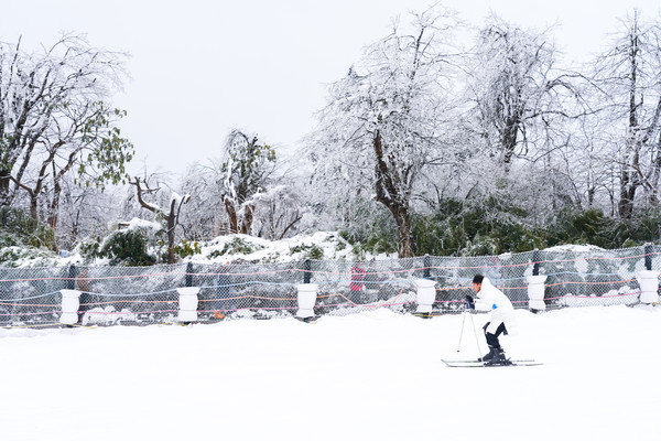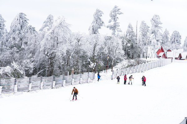 在金顶赏完雪,如果觉得不尽兴,可以到雷洞坪的滑雪场换一种更亲近的方式去感受一下峨眉山的冬天。雷洞坪滑雪场建于1998年,是川内第一个滑雪场,如今已经是周边游客冬天首选的滑雪