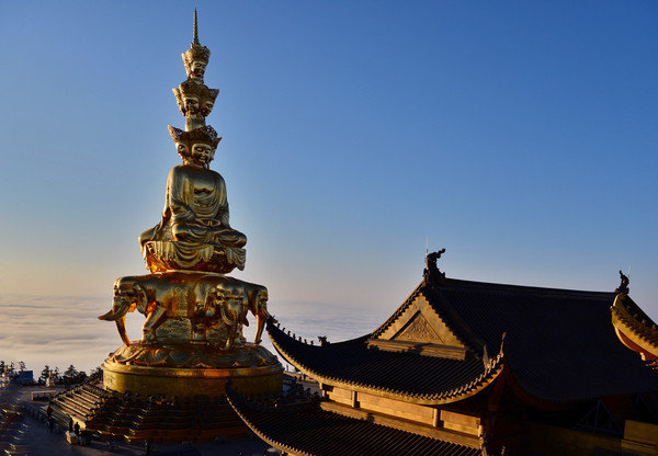 金顶为游客游峨眉山的最高点也是终点,海拔3077米,峨眉山金顶始建于唐朝,屋顶为锡瓦所盖,如今的金顶已经不同于往日,真的可以用霸气来形容,金顶上最为耀眼的就是这座高高耸立的普贤菩萨金像了,远远的就能看到它在阳光下闪闪发光。