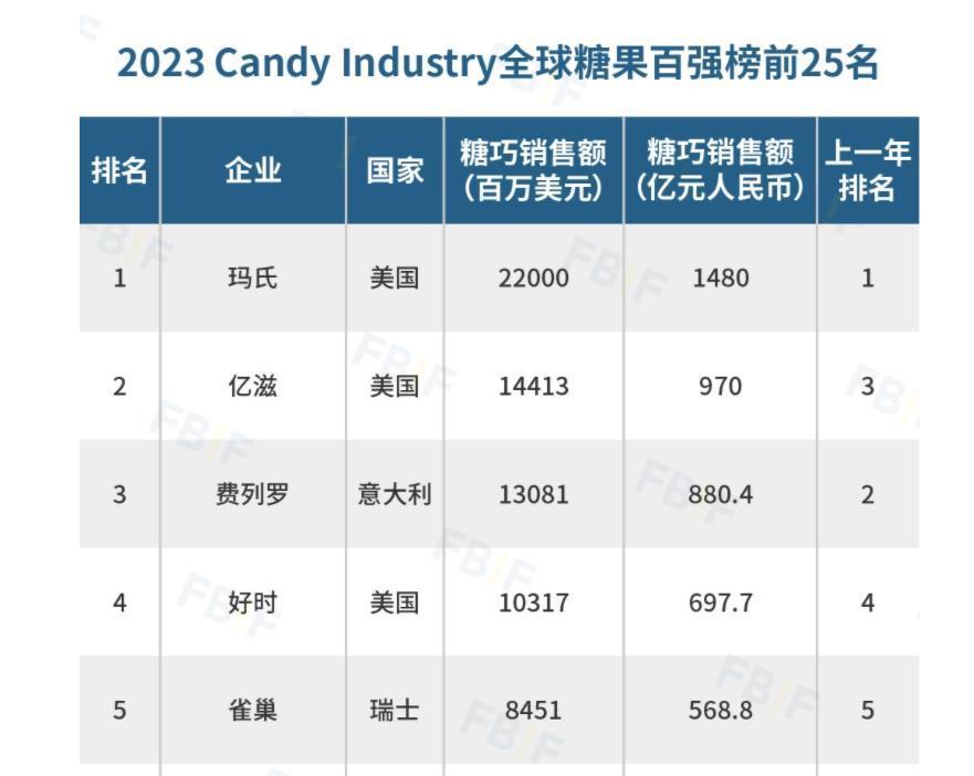 东西方饮食习惯大不相同,就连零食上的选择也很不相同。在我们国内畅销零食多数是坚果、鸭脖、辣条等。欧美消费者则喜欢糖果、巧克力以及薯片。美国是世界上最大的糖果消费市场,有数据称美国每人每年要消费大约7公斤糖果。根据机构最新公布的“2023全球糖果百强榜单”显示,前五名中美国公司占了3家,全球排名第一的糖果公司正是诞生于美国,该公司糖果和巧克力的总销售额达到1480亿元,甩开了亿滋、费列罗、好时、雀巢等知名糖果巧克力巨头。