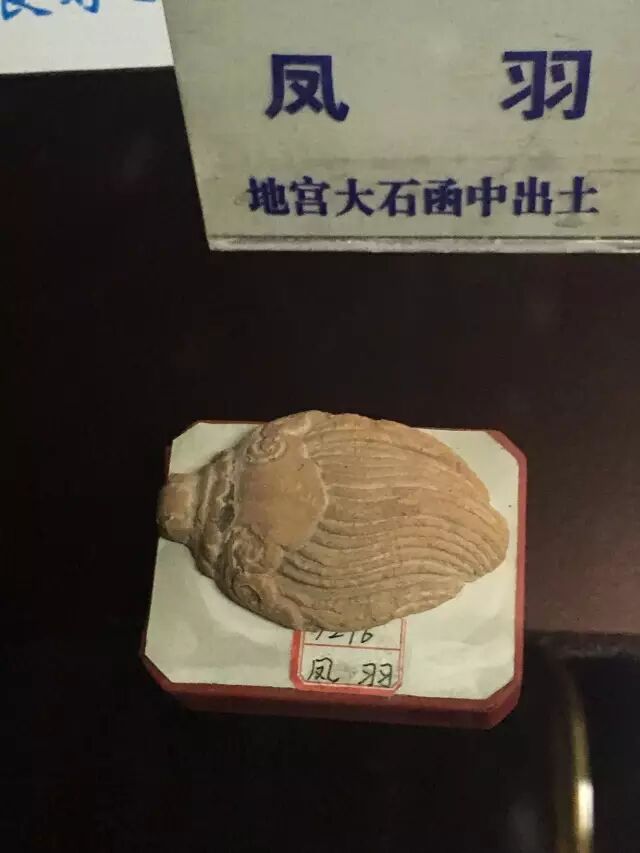 转至塔后有地宫入口,一米来宽的石壁通道进入其间顿有凉意,一室陈列着地宫出土石函所藏风羽、麒麟角、龙珠、黑石子等物,再入一室便是供奉佛牙及石函所藏处。大小石函皆有纹样和铭文雕刻。