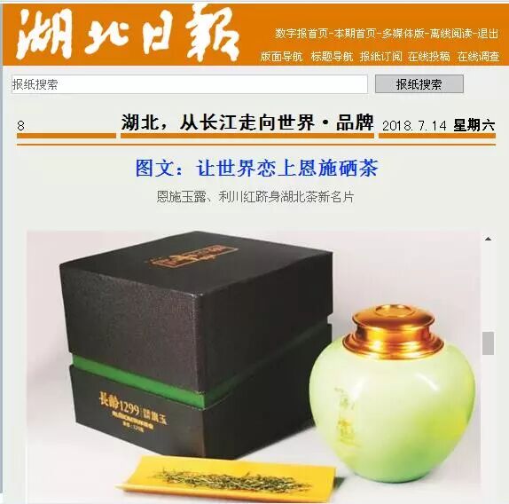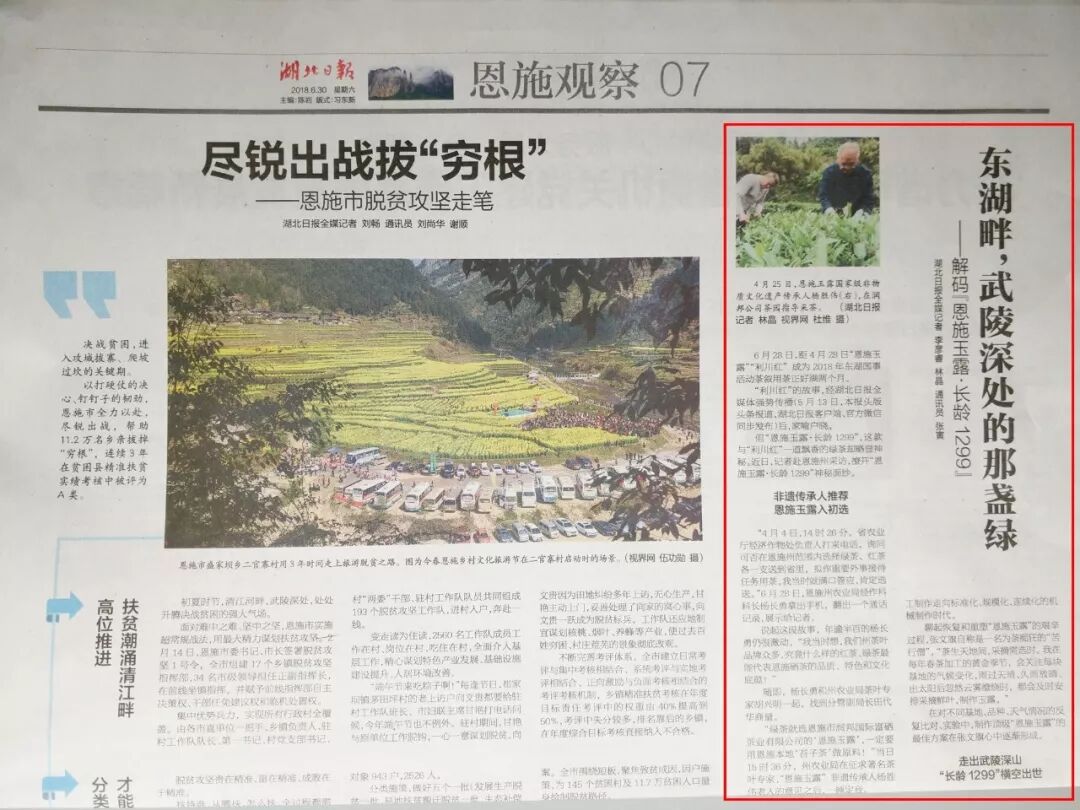 6月30日,《湖北日报》刊登了题为“东湖畔,武陵深处的那盏绿”的文章,再次解读了恩施玉露长龄1299的神奇魅力。↓↓↓
