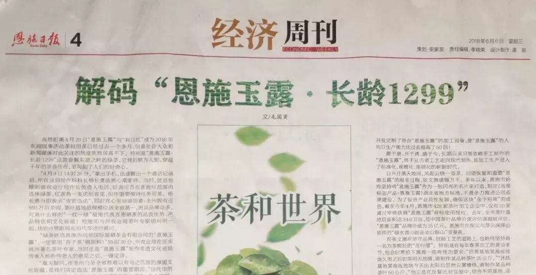 6月6日,《恩施日报》整版刊登了题为“解码恩施玉露长龄1299”的文章,全面报道了恩施玉露当选为武汉东湖茶事活动用茶的全过程。↓↓↓