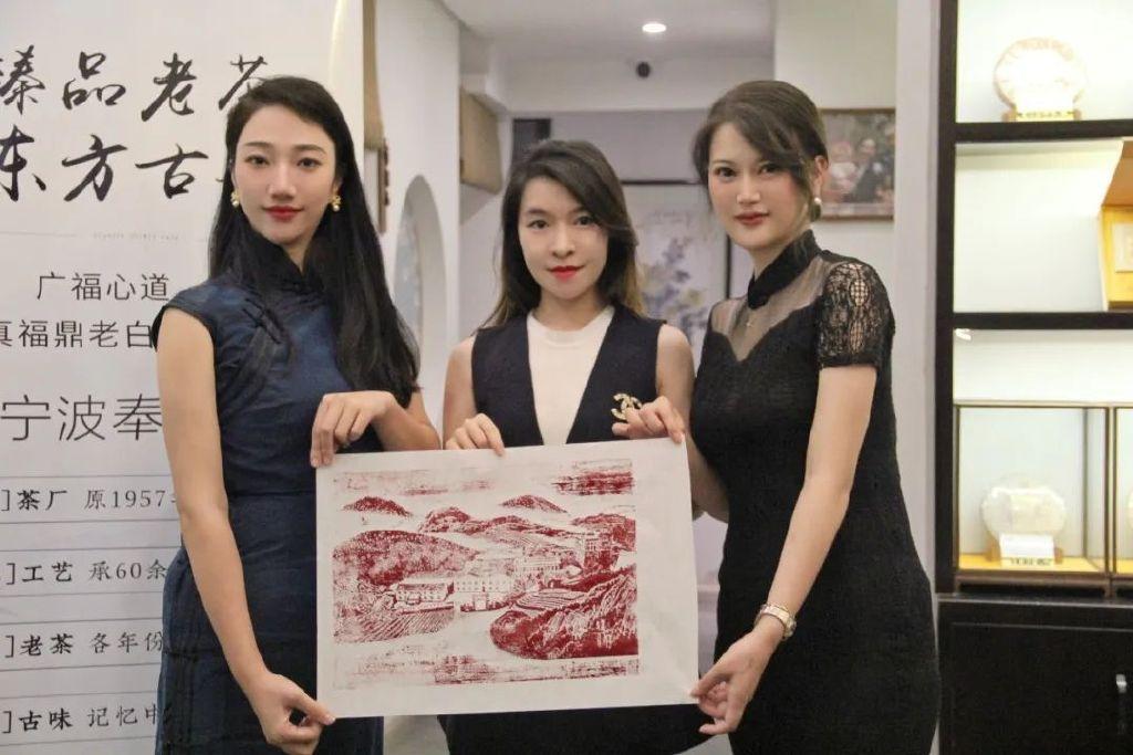 广福心道总经理林丽丽与嘉宾展示国营茶厂拓印版画
