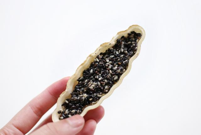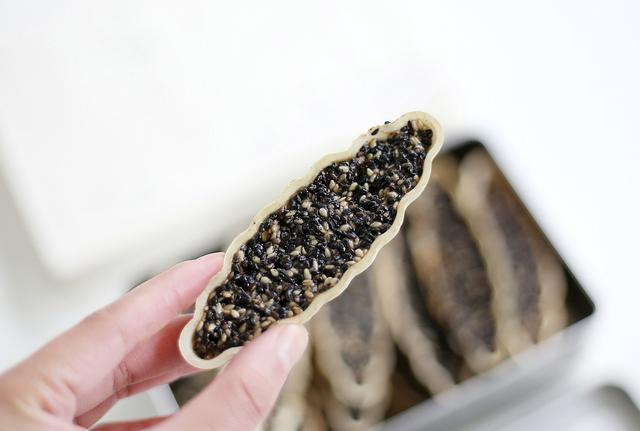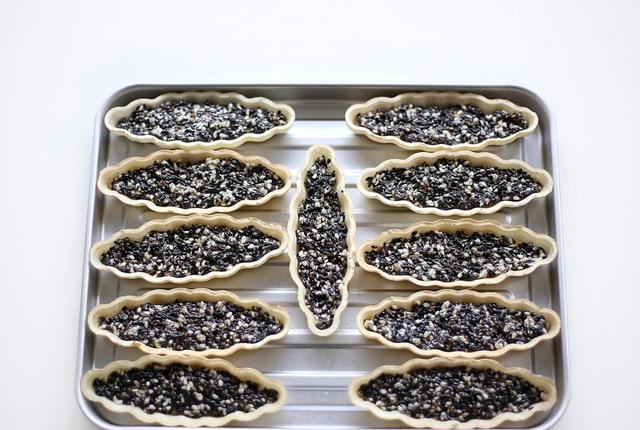 4、取一块大号糯米船,戴上一次性防粘手套,将适量的芝麻馅铺在糯米船内,铺的时候,要用手压平整。馅料的高度在糯米船的一半高即可,太高的话,烘烤的时候会溢出来。另外大号糯米船也可以用小号糯米船替代,如果用小号的话,需要多准备一些