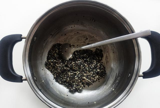 3、熬好的糖浆离火后,快速倒入熟的黑白芝麻,混合均匀。因为现在还是早春,温度并不高,糖浆在离火后,遇冷会很快凝固,所以我们混合芝麻的手速,必须得快。