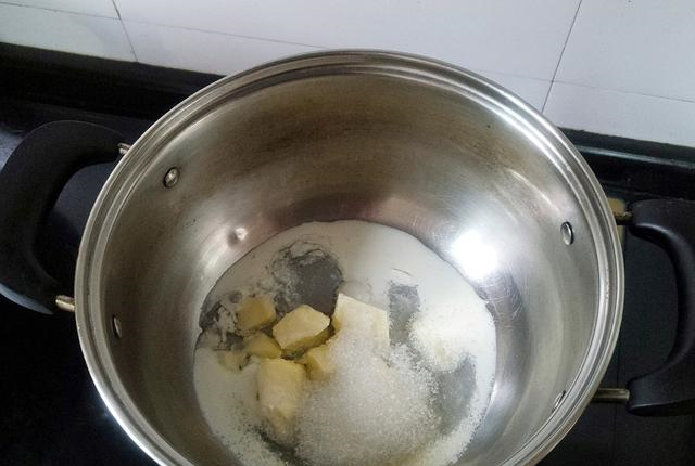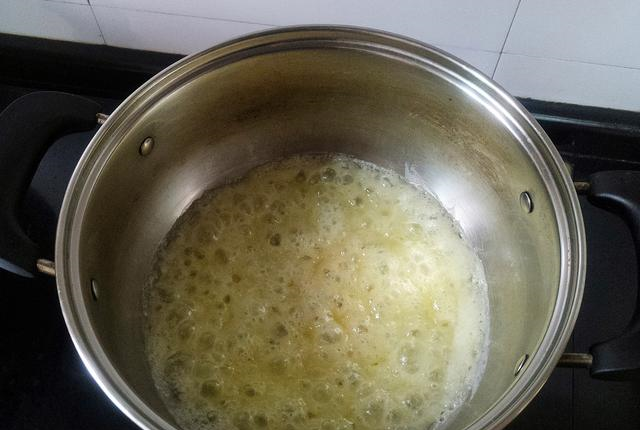 2、等加热到锅内材料完全融化,并且液体的每一处都在冒泡泡后,就可以熄火了。很多人做这一步喜欢用温度计来测,其实完全没必要,只要熬煮到我说的这个状态就可以了,亲测有效。
