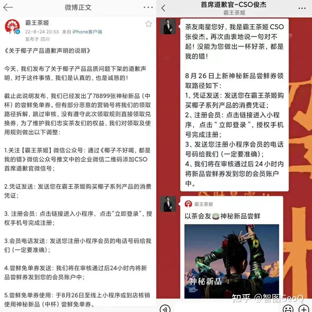 在今年8月,霸王茶姬上新新品遭遇大量吐槽险些“翻车”。但其创始人亲自“下场”道歉,自嘲为“首席道歉官”,并进行补偿。这样的举动一度让霸王茶姬一度冲上微博热搜。