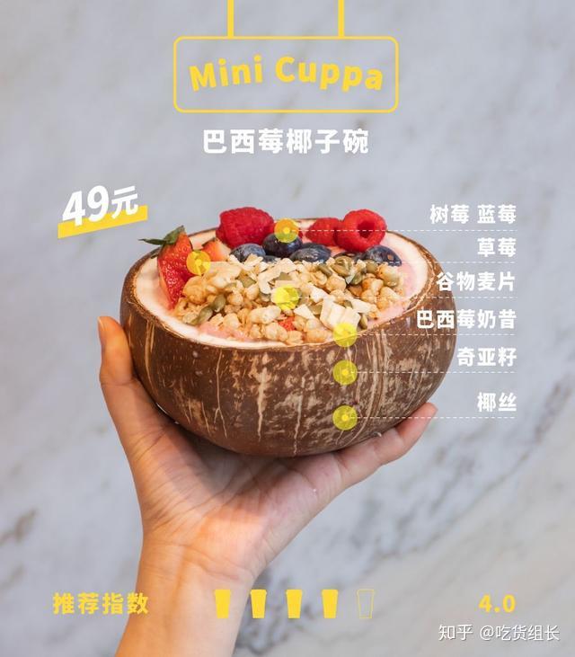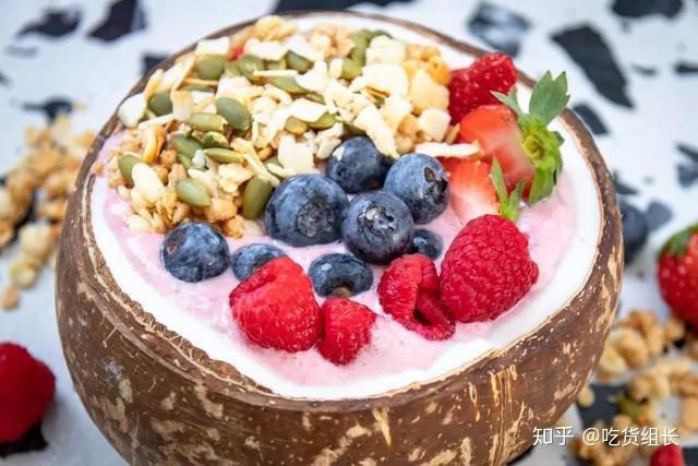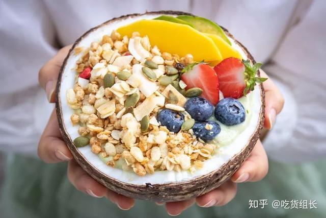椰子碗里的水果新鲜饱满,个个都是饱含花青素、维生素C、水果纤维等多种营养成分的小宝贝们。这份高营养、低热量的“神仙碗”,不仅酸酸甜甜的很开胃,脆脆的谷物还增加了饱腹感,一碗代一餐都没问题。