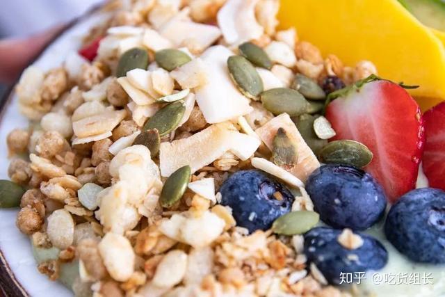 顶上的椰丝、南瓜子和谷物麦片一看就是健康餐标配。谷物追求五谷粗粮的本味,嚼起来口感十分丰富。