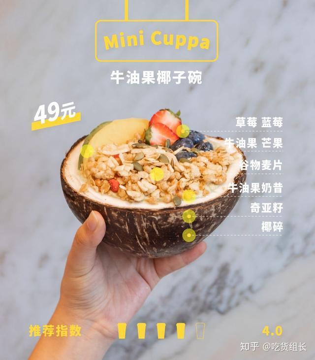 牛油果椰子碗与巴西莓如出一辙,换上了牛油果奶昔底,添加了牛油果和芒果切片。色彩基调牢牢追随今年最流行的牛油果色,清新脱俗。