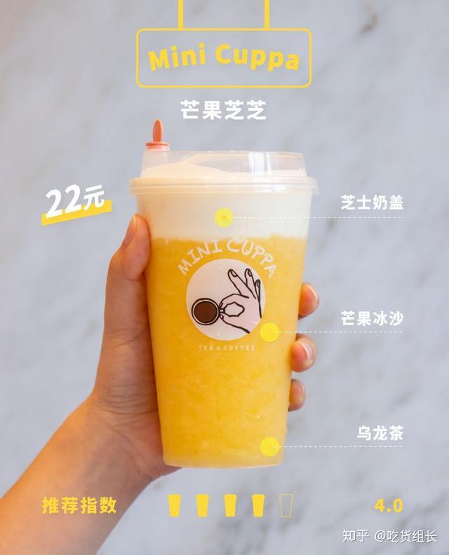 黄嫩嫩的芒果芝芝充满活力,Mini Cuppa 的“元气奶茶奖”颁给它再合适不过。竖个大拇指,点赞它家的芒果选品,果肉酸甜可口,肉质肥厚细滑,基本感受不到果肉的纤维,超OK!乌龙茶底和芒果冰沙和谐共处,谁都不抢戏,果香中乌龙茶香悠然,好一对默契拍档。