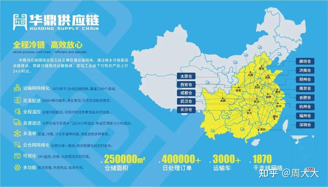 在疫情危机中,与100000+餐饮终端门店冷链物流履约的华鼎供应链,也在不断完善冷链物流基础设施建设,已搭建13个省级中心仓、仓储面积25万㎡、干支线网络1870条,辐射全国20多个省、243个地级市、1749个县,冷链直达县乡区域的全国协同化冷链仓配网络,为更多客户的跨区域业务和全国化发展提供了坚实的战略支撑。