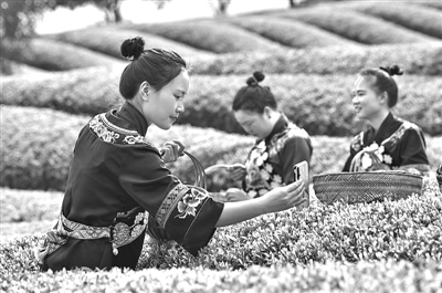 3月21日,贵州省铜仁市松桃苗族自治县普觉镇园埂脚村脱贫攻坚帮扶干部走进茶园,通过手机直播,帮助茶农现场销售春茶,助农增收。龙元彬摄/光明图片