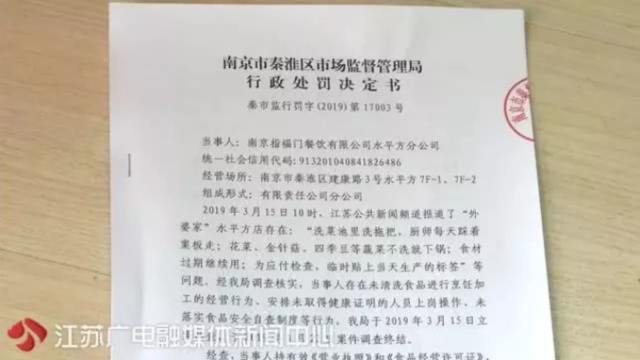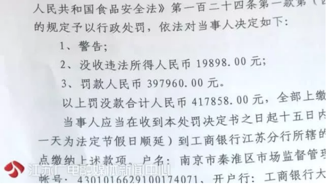 当天,主管部门就勒令这家店面停业整顿,并接受调查处理。经过近半个月的调查,3月28日,南京市秦淮区市场监督管理部门对这家餐厅正式下达了行政处罚决定。