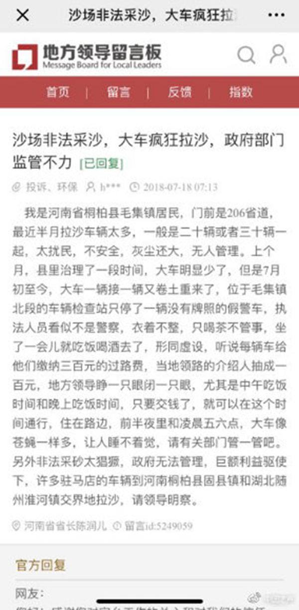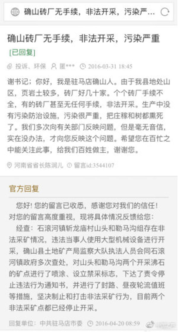 记者搜索相关资料发现,在一家权威媒体的政务留言板上,2013年、2016年、2019年,先后有多位确山县的网友给省委书记留言称,确山县西部山区挖山毁林等违法行为猖獗,伐木烧炭、毁林挖矿等乱砍滥伐现象普遍,山体被“吞噬”,森林资源不能得到有效保护。