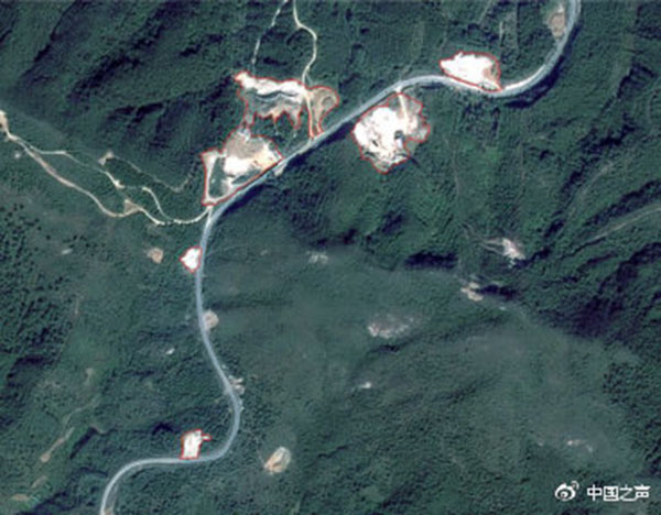 确山县石滚河镇刘楼村S206道路旁,红色圈内为开山采石区域,面积总和达到2645平方米确山县石滚河镇刘楼村S206道路旁,红色圈内为开山采石区域,面积总和达到2645平方米