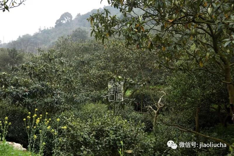 茶树、果树交织种植在一起的,甚至很多群体种茶树都是这儿一丛、那儿一棵散落在果树中间生长。