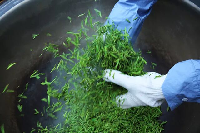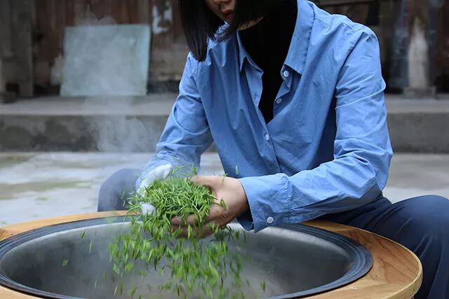 杀青时抛闷结合,快速提高叶温的同时也散发水气。用鼻嗅眼看来判断是否青气散尽,杀青到位。