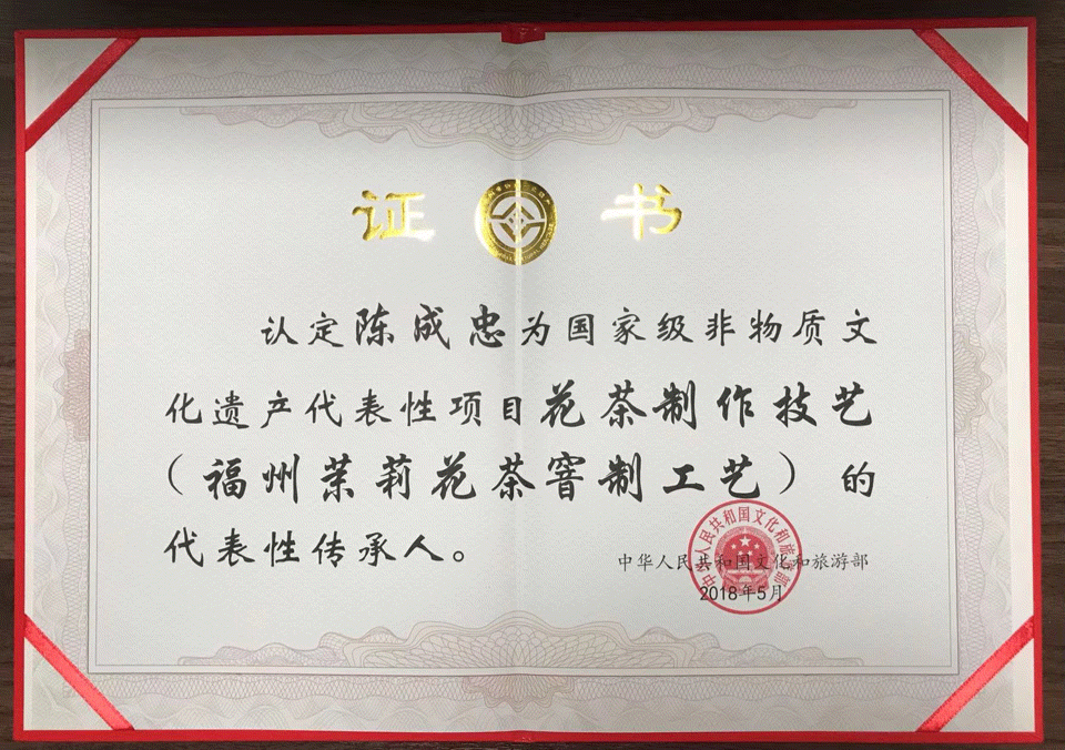 2014年11月,福州茉莉花茶传统窨制工艺被列入国家非物质文化遗产保护名录。