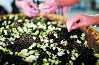 把鲜花平摊在干净窨花场地上,厚度为10—15cm,然后根据茶、花配比用量的鲜花,同样分出1/3—1/5均匀的撒铺在茶胚面上,这样一层茶,一层花相间3—5层,茶胚和鲜花边拌边的方法进行“窨花”。