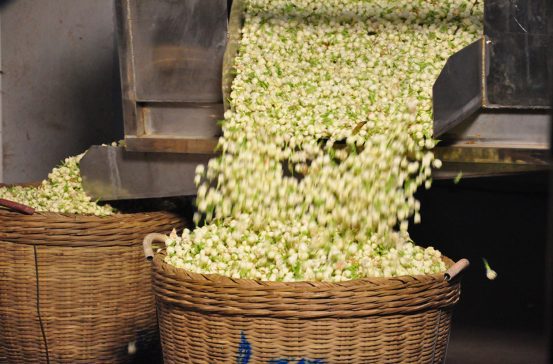 成熟的花蕾如果未达到适当的开放度即与茶坯拌和,由于受茶叶挤压损伤水分被茶叶吸收,以及缺氧等原因就不再开放,因此也就不香。相反,如果开放过度,则香气散失。所以,茉莉花采下以后要经过适当的摊放与堆积,以促使花朵开放匀齐。