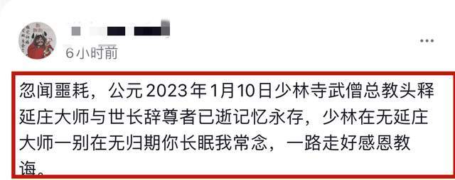 1月11号,诸多网友在社交网上分享了一则悲痛消息,来自少林寺的“武僧总教头”释延庄不幸圆寂,终年58岁。