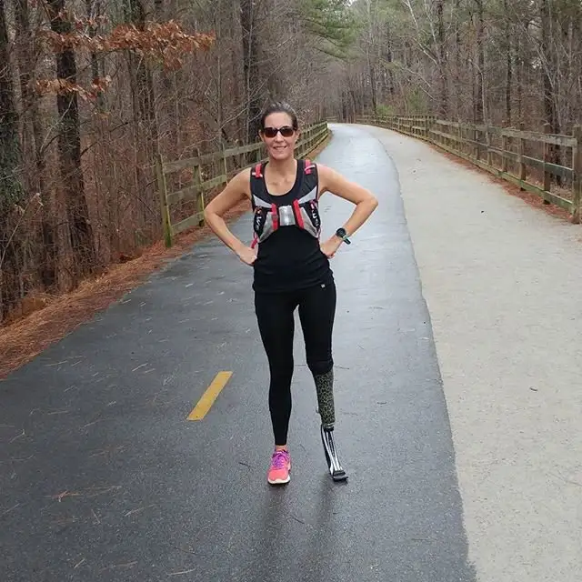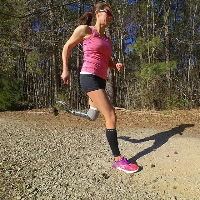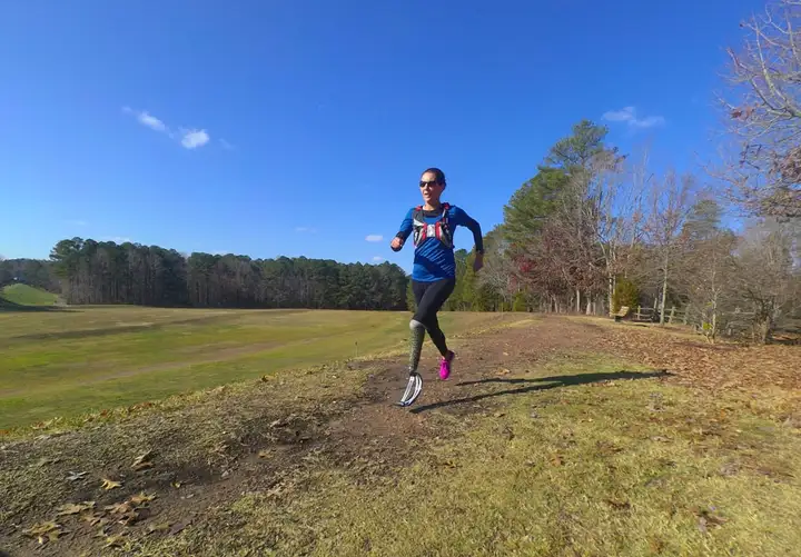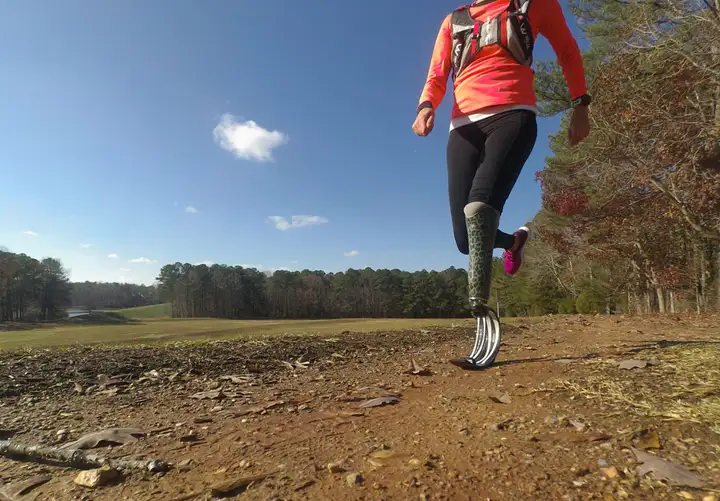 杰姬从2016年开始戴着假肢跑步,跑步之前要先确定已经可以戴着假肢非常自如的走路甚至快走,也能很顺利的转弯、后退,才可以尝试戴着假肢跑步——跑步意味着两条腿交替落地前行,中间有腾空状态,不像走路总是有一条腿与地面接触。