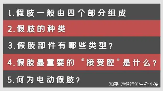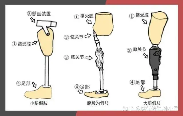 ①接受腔:身体与假肢的连接部分②悬垂装置:身体与接受腔的连接部分③关节:替代关节,含踝关节,膝关节,髋关节④脚部:触地部分,脚踝到脚掌接受腔、悬挂方法、支撑构造及脚踝到底如何处置,取决于身体机能、个人能力、年龄、活动量及生活方式。