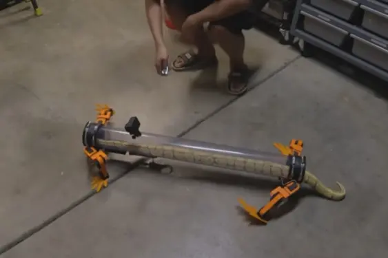 据外媒报道称,一位名叫“Allen Pan”的YouTube博主近日上传了一段视频引得了不少人的关注。在视频中,该博主制作了一个带有四条机械腿的管状外壳,让蛇进入其中。为了能够让体表光滑的蛇固定在管道中不会溜出,他还对管壁进行了一些改造,最终成功让蛇能够相对固定在管道内、为了让机械四肢能够配合蛇移动,他还特地编写了一套能够让机械四肢跟随蛇的蠕动前进的程序,让这条蛇有了四脚爬行的能力。