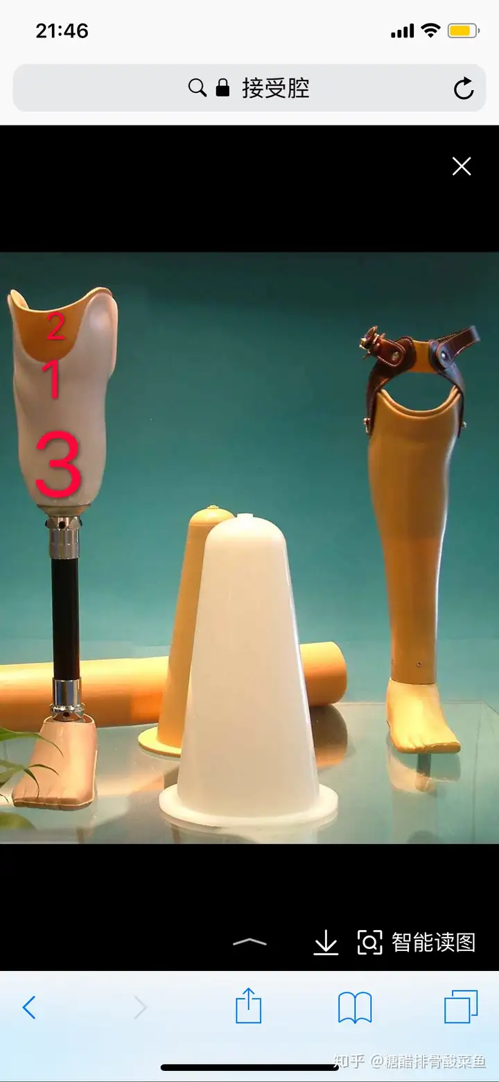 如图左边所示,2-3的地方就叫做接收腔组成材料为板材、树脂或者碳纤,现代假肢的活动方式是膝盖下(图中标1处)胫骨为受力点,在穿戴假肢时它支撑着患者的整个体重!因为胫骨受力并不会疼痛所以现代假肢穿戴后只要训练好走路姿势,和适应了胫骨受力在往后的生活中并无痛苦。图中标2处叫承筒,也叫内衬套,它是穿戴在残肢上的,就像给脚穿袜子一样,穿上内衬套后往接收腔里一插就可以走路了。图3就是残肢接触面了,这个地方也很关键,接收腔做得好图3部位的残肢不会和接收腔摩擦也就是说不会磨烂皮肤,反之就会使皮肤疼痛出血,影响走路!所以找个好师傅做接收腔尤为关键!!!