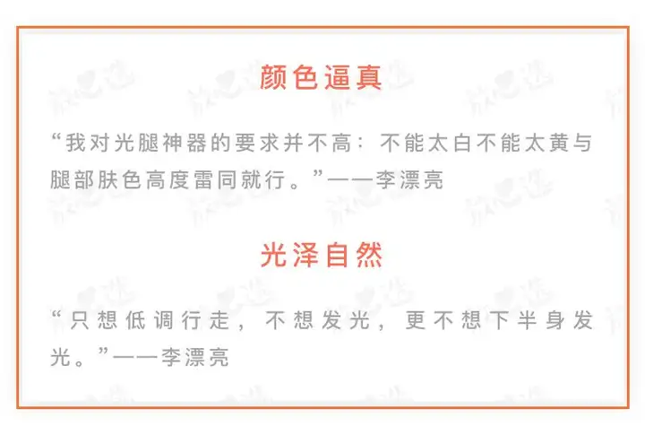 乍一看,大部分光腿神器颜色差不多,但上腿效果差距惊人,一点点颜色的偏差都可能让你宛如接了假肢!更有甚者,上腿宛如抹了层猪油blingbling的,李漂亮就问一句,你们见过哪条正经腿自带发光效果的?