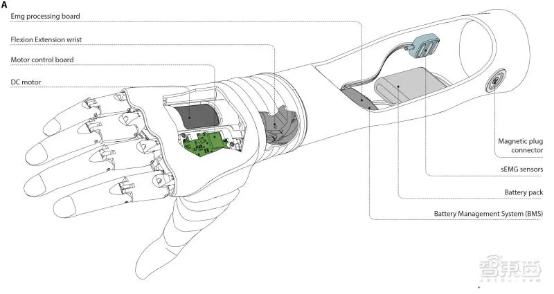 Hannes主要由三个相互作用的部分构成:包括一个肌电多关节假肢手、一个屈曲手腕模块以及一个肌电系统控制器。其中,肌电系统内包括两个表面肌电图传感器、电池组和控制电子设备。