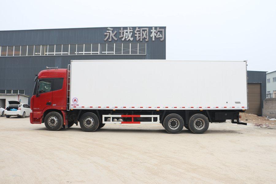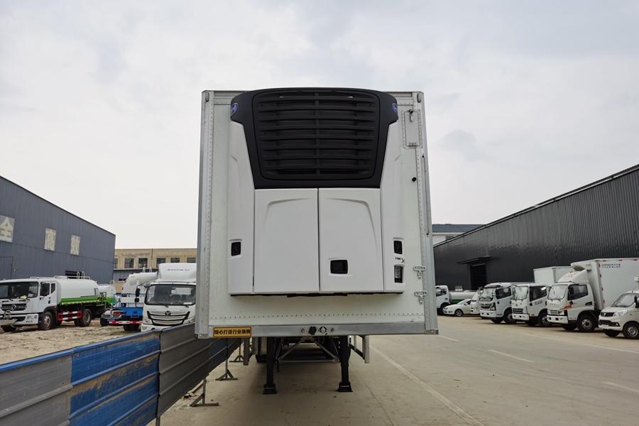 箱体材质:内外玻璃钢,左右侧板8公分厚,顶板10公分厚,底板10公分厚,箱体内部顶板加装通风布,双侧门。行走部分为13吨3轴富华桥(钢板式),二个备胎架,铁护栏,铁保险杠,铁工具箱。其他按挂车标准,底板铺 U型铝道轨,后马蹄焊连,大包边,后门双杠,车自重8.65吨。
