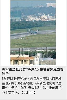 人民网9月26日电据共同社报道,9月25日,美国海军陆战队向冲绳县普天间机场新部署的12架新型运输机“鱼鹰”中最后一架25日从山口县岩国基地飞抵该机场,第二批部署工作全部完毕。加上去年部署的12架,普天间机场的“鱼鹰”共达到24架。