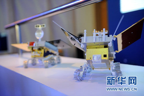 继成功实施嫦娥一号、嫦娥二号任务之后,我国将于今年12月初,在西昌卫星发射基地发射嫦娥三号探测器,并拟开展嫦娥三号月球车全球征名活动。9月25日,嫦娥三号月球车全球征名活动新闻发布会在北京举行。图为发布会现场摆放的月球车模型。(新华网陈竞超摄)