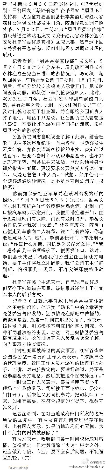 新华视点:【陕西眉县回应“副县长投诉之后保安被辞退”事件】日前有网友发帖称:陕西宝鸡眉县副县长李某酒后与红河谷森林公园保安杜某发生口角,随后授意公园开除杜某。22日,注册名为“眉县县委宣传部”的账号通过该贴吧发文回应,然而这个回应并没有平息事态,反而引起网友对调查过程的质疑。
