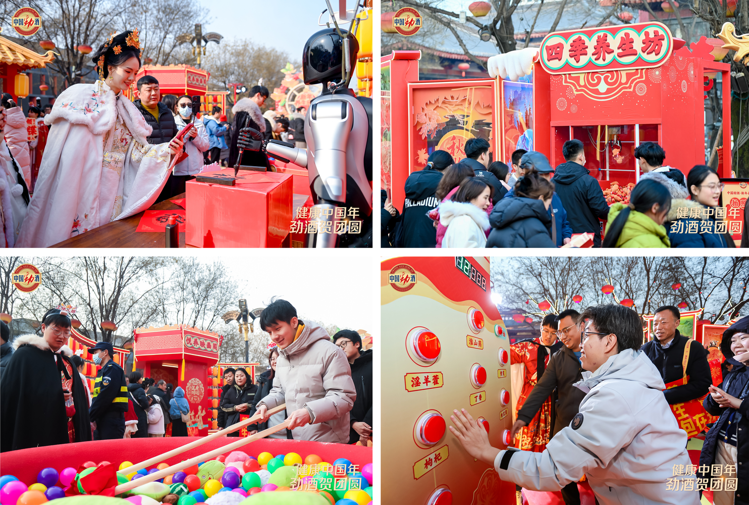 围绕“健康中国年,劲酒贺团圆”,现场被设计成五大互动区域:以调饮与集章玩法开启游玩动线的「劲酒团圆驿站」,生成AI古风影像的「悦养映画阁」,以草本认知互动为核心的「草本摩天轮」,用抓娃娃形式演绎“抓紧四季养生”的「四季养生坊」,以及承载祝福与团圆情绪的「福满新年家」。